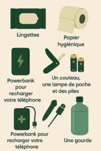 - Trousse de secours (médicaments, antalgiques, anti-diarrhéique, pansements et bandages, désinfectant, pansements pour ampoules)